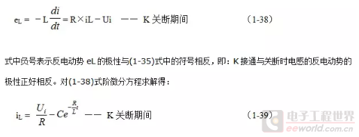式中C为常数,把初始条件代入上式,就很容易求出C,由于控制开关K由接通状态突然转为关断时,流过储能电感L中的电流iL不能突变,因此,i(Ton+)正好等于流过储能电感L的最大电流ILm,所以(1-39)式可以写为: