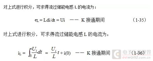 在Ton期间,控制开关K接通,储能滤波电感L两端的电压eL正好与输入电压Ui相等,即:eL=Ldi/dt=Ui——K接通期间(1-35)