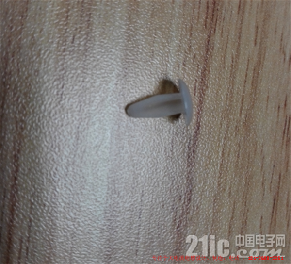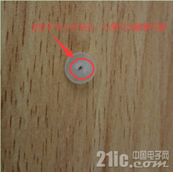 6)设计触摸钮,可选用纽扣形状的硬质塑料,我选用的是塑料胶钉,并在胶钉上开孔,引出触摸脚。
