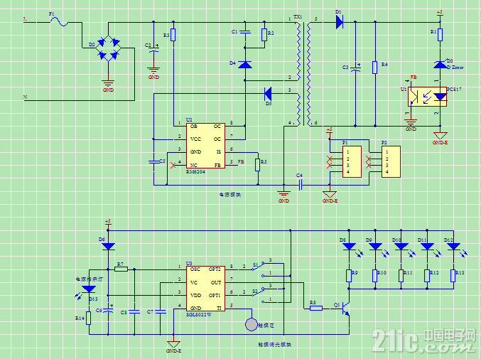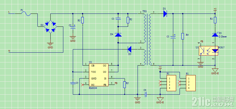 原理分析:采用反激式开关电源原理,前级桥式整流滤波后经反激变压器传递能量,控制芯片RM6204采用内置800V高压三极管实现开关,减少外部器件,同时集成电流内环(通过检测电阻R5端电压反映当前峰值电流),电压外环(通过隔离光耦817和稳压管来对输出电压采样控制)的双闭环控制,是目前开关电源界常用的控制方式,以此来达到输出稳定,隔离的电压。