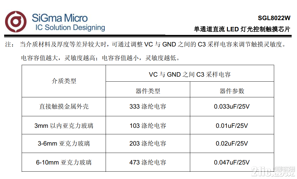 同时该触摸芯片的触摸灵敏度可调,见Datasheet所述: