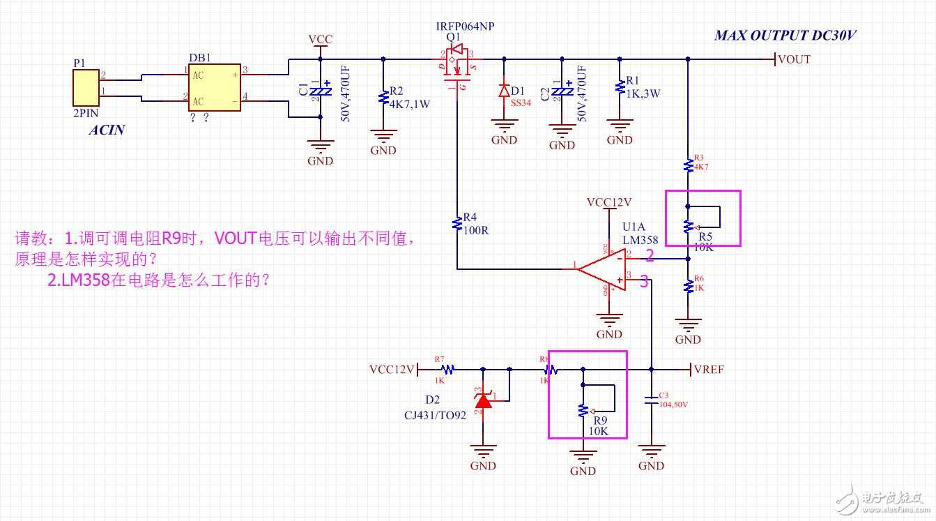 如图,请教下1.当调可调电阻R9时,VOUT会输出不同电压,原理是怎样的 2.lm358z在这电路是怎么工作的