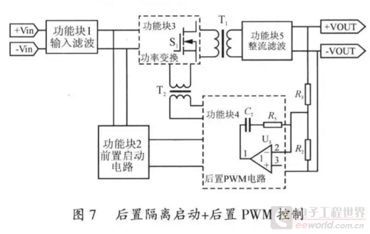 而如图7所示,后置隔离启动+后置PWM控制方式框图,输出电压的稳定过程是:输出误差采样→PWM电路误差比较→PWM调宽→隔离驱动→输出稳压。