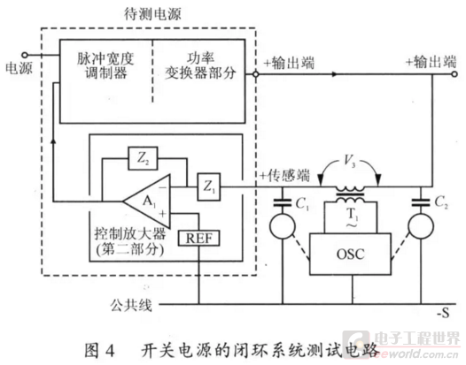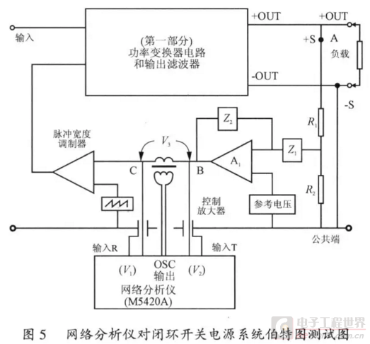 如图4所示为测量闭环电源系统波特图的增益和相位时采用的一个常用方法,此方法的特点是无需改动原线路。
