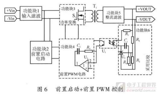 如图6所示,前置启动+前置PWM控制方式框图所示,输出电压的稳定过程是:输出误差采样→比较→放大→光隔离传输→PWM电路误差比较→PWM调宽→输出稳压。