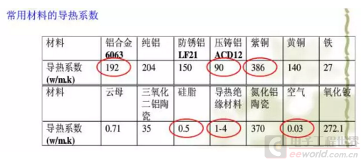 不同的散热材料热阻相差很大,所以要想得到良好的散热效果那么一定要选热阻小的散热材料,绝缘垫片的热阻也是各不相同,下面是一些散热材料的导热系数,系数越高,说明散热效果越好,热阻越小。